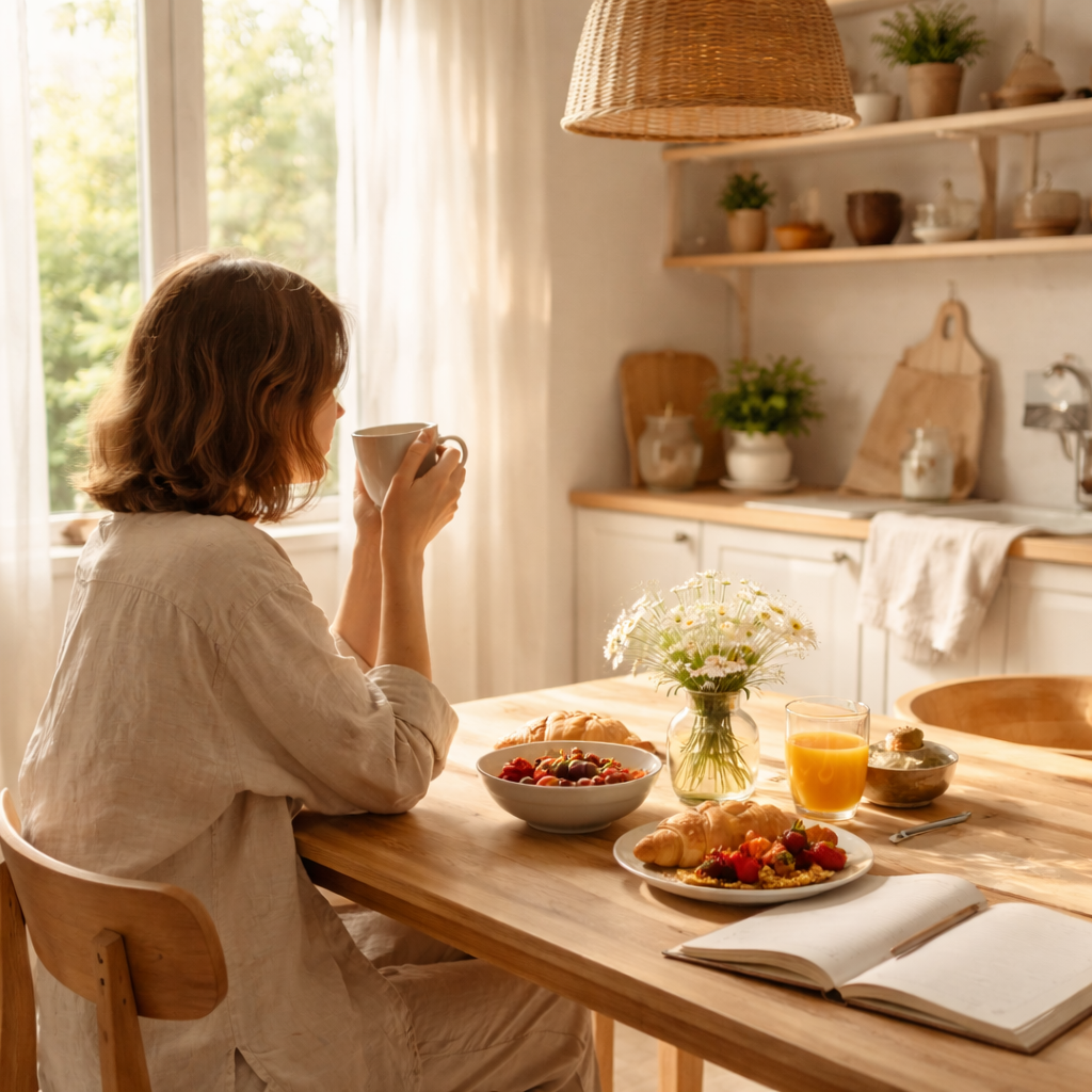 Sarapan juga bisa menjadi momen istimewa. Tidak harus mewah — roti hangat, buah segar, atau hidangan sederhana yang disiapkan perlahan sudah cukup. Duduk tanpa tergesa-gesa dan benar-benar menikmati waktu makan bisa membuat pagi terasa lebih panjang dan penuh perhatian.